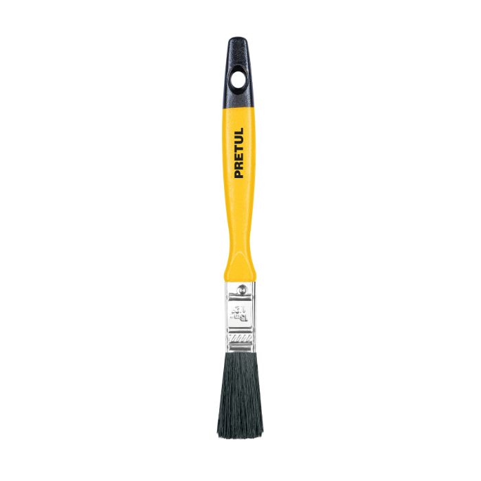 La brocha Pretul de 1/2″ con mango de plástico cuenta con cerdas finas compuestas en un 80% sintéticas y 20% naturales que aseguran una excelente retención de pintura y un acabado uniforme. Sus cerdas, fijadas con resina epóxica al casquillo, evitan desprendimientos durante el uso, mientras que el mango de polipropileno ligero proporciona un agarre cómodo y preciso. Es ideal para aplicar pintura, resina, pegamento, acetona y solventes en superficies de concreto, metal, estuco y madera.